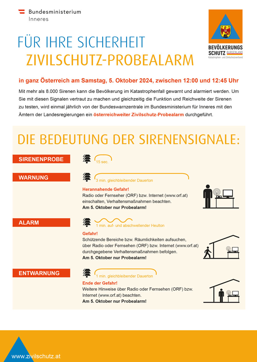 Der jährliche, bundesweite Zivilschutz-Probealarm wird heuer am Samstag, 4. Oktober in der Zeit von 12:00 bis 12:45 Uhr durchgeführt.